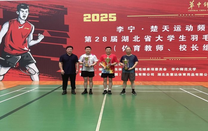 本网讯 7月12-13日,由湖北省学生体育协会举办的第28届湖北省大学生羽毛球锦标赛(体育教师、校长组)在华中师范大学佑铭体育馆举办。我校代表队荣获校长杯第五名、教师组团体冠军。